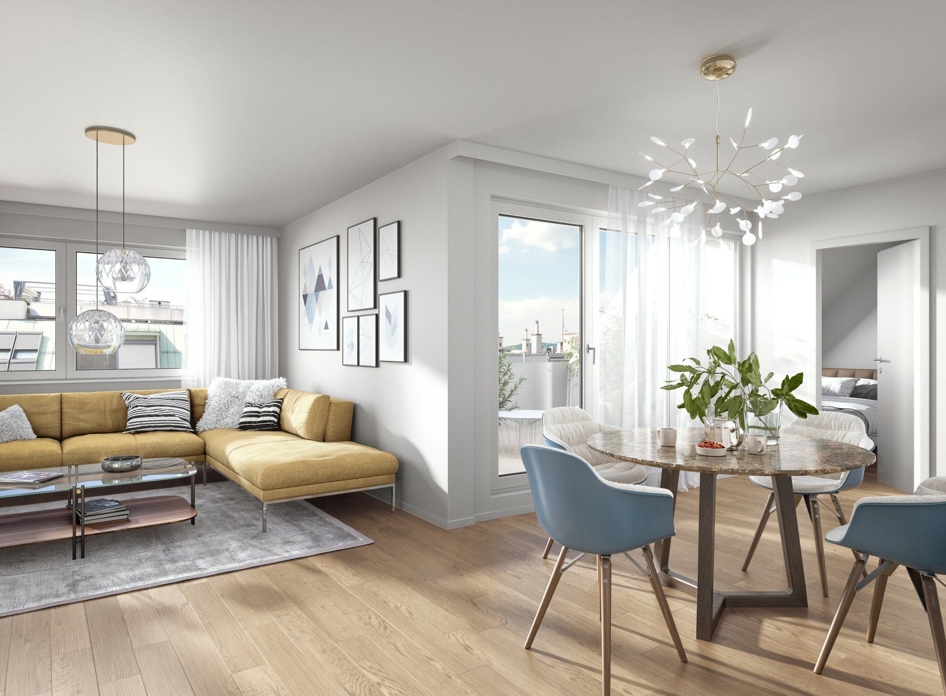 Die 2- bis 4-Zimmereinheiten verfügen über ca. 44 bis 121 m² Wohnfläche und beeindrucken mit attraktiven Loggien oder Terrassen, die das Leben großzügig nach außen tragen. Liebevoll gestaltete und in den Innenhof orientierte Eigengärten laden zum Gärtnern, Spielen oder Verweilen im Grünen ein. Im obersten Geschoß lockt die großzügige Dachterrasse zu wunderbaren Stunden unter freiem Himmel.